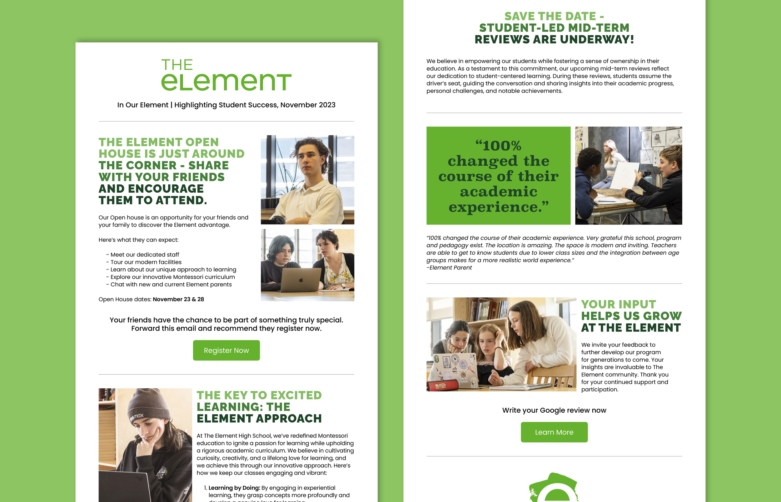 The Element High School is an innovative high school in Ottawa that serves grades 7-12 by integrating Montessori principles to promote academic excellence and creativity.
